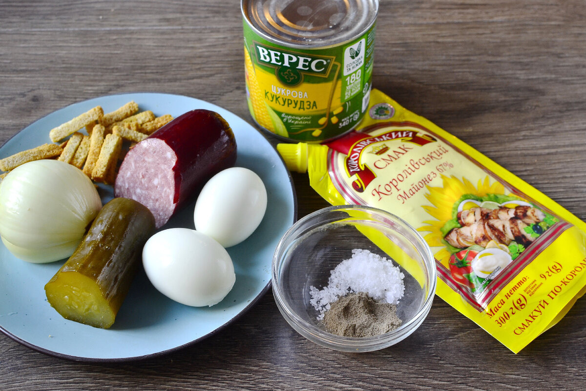 Казалось бы, чем может удивить обычный салат с колбасой? А нет, может. Готовиться он быстро, довольно просто. Ничего варить долго не надо, ну разве что, яйца нужно отварить. Благодаря сухарикам и маринованным огурцам, салат получается пикантным. Если любите похрустеть, то подавать салат нужно сразу после приготовления. А если любите нежные салаты, то даём сухарикам немного размякнуть. Ингредиенты · Колбаса копченая 200г. · Консервированная кукуруза 100г. · Сухарики 100г. · Яйца 2шт. · Огурцы маринованные 1-2шт. · Лук репчатый 1шт. · Майонез 100г. · Соль и молотый черный перец по вкусу Приготовление Копчёную колбасу нарезаем кубиками. Вместо колбасы можно использовать балык или ветчину. Репчатый лук очищаем и мелко шинкуем. Если лук очень горький, то его можно предварительно обдать кипятком на несколько секунд. Маринованный огурец нарезаем кубиками. Яйца отвариваем, охлаждаем и очищаем. Нарезаем средними кусочками. Консервированную кукурузу открываем и сцеживаем маринад. Добавляем куку