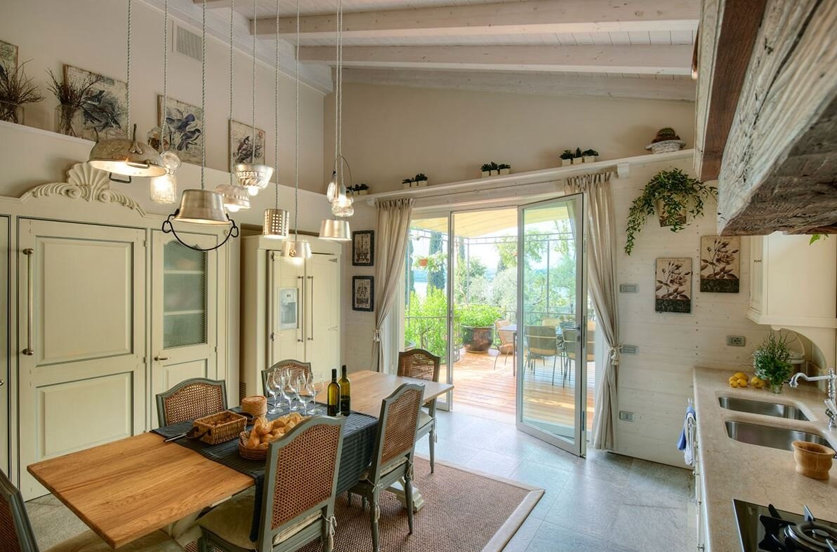 На фото кухня роскошной виллы на озере Комо, модель DHIALMA итальянского премиального бренда MARCHI CUCINE. Массивная доминатная вытяжка выполнена полностью на заказа, а дровяная печь придает кухне атмосферу домашнего уюта.