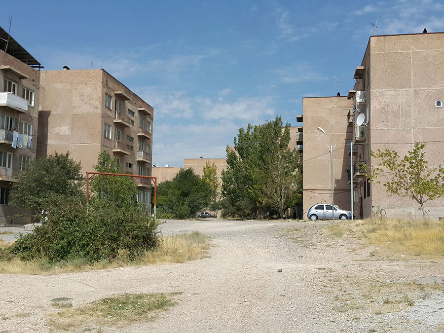 https://yandex.ru/maps/-/CCUk6Xxy3B У этого места есть своя история. Район закладывался в 89-90гг как городок беженцев. В 91-м стройка заглохла, беженцы, живущие во временном городке в вагончиках, постепенно разъехались. Дома были достроены в 1994-95 годах при содействии ООН, а не государства. "Достроили", конечно, сильно сказано, строители просто довели до ума уже построенные в 90-м году коробки домов, но и на том, конечно, спасибо. Со спутника хорошо видны фундаменты, заложенные в те далекие годы и до сих пор так и не выросшие в дома: Эти дома на горе, "Սարի շենքեր" [sari shenk'er], как их сейчас называют, находятся немного на отшибе от г. Бюрегавана, которому принадлежат административно. Первоначальный проект подразумевал строительство целого обустроенного микрорайона с соответствующей инфраструктурой. Увы, этим планам не суждено было сбыться. Вся инфраструктура, социально