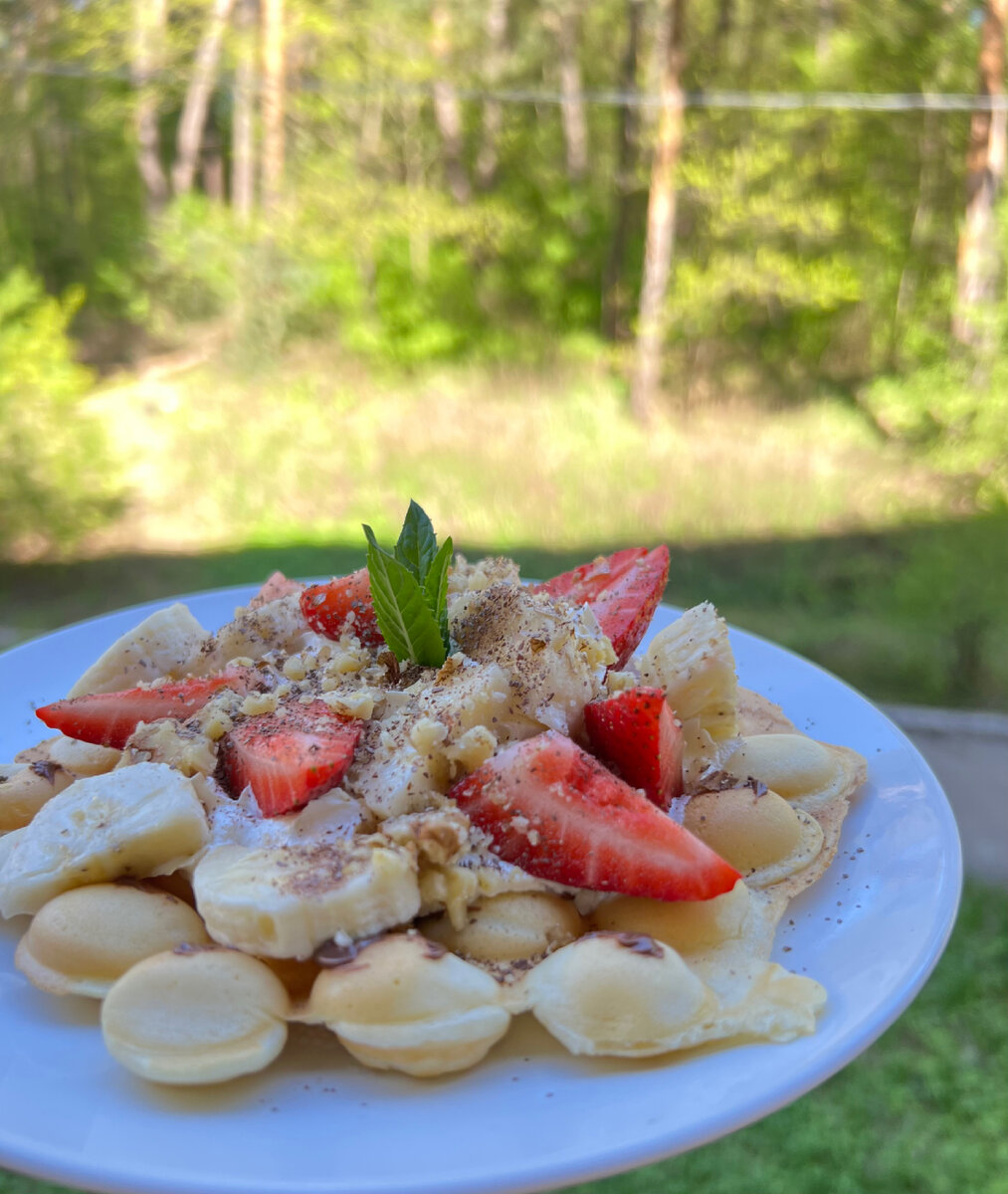 Ингредиенты: Способ приготовления: Количество ингредиентов рассчитано на приготовление 3 вафель. В качестве начинки используйте взбитые сливки, мороженное, сливочный крем или сыр маскарпоне, добавьте ягоды, фрукты, орехи, сухофрукты, варенье, сгущенку или сироп, исходя из ваших предпочтений.