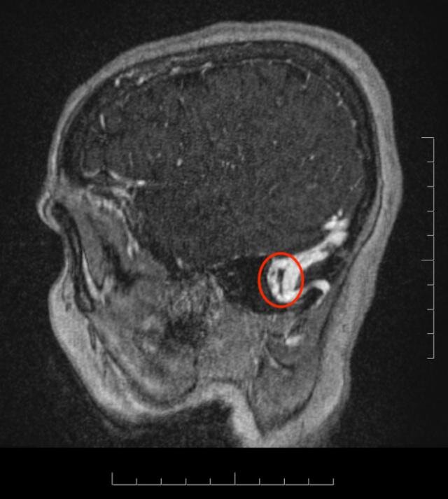 На МРТ с ангиографией и венографией: тромбоз левого сигмовидного синуса, частично пустое турецкое седло, заполнено ликвором. Двусторонний отек зрительного нерва, внутричерепная гипертензия.