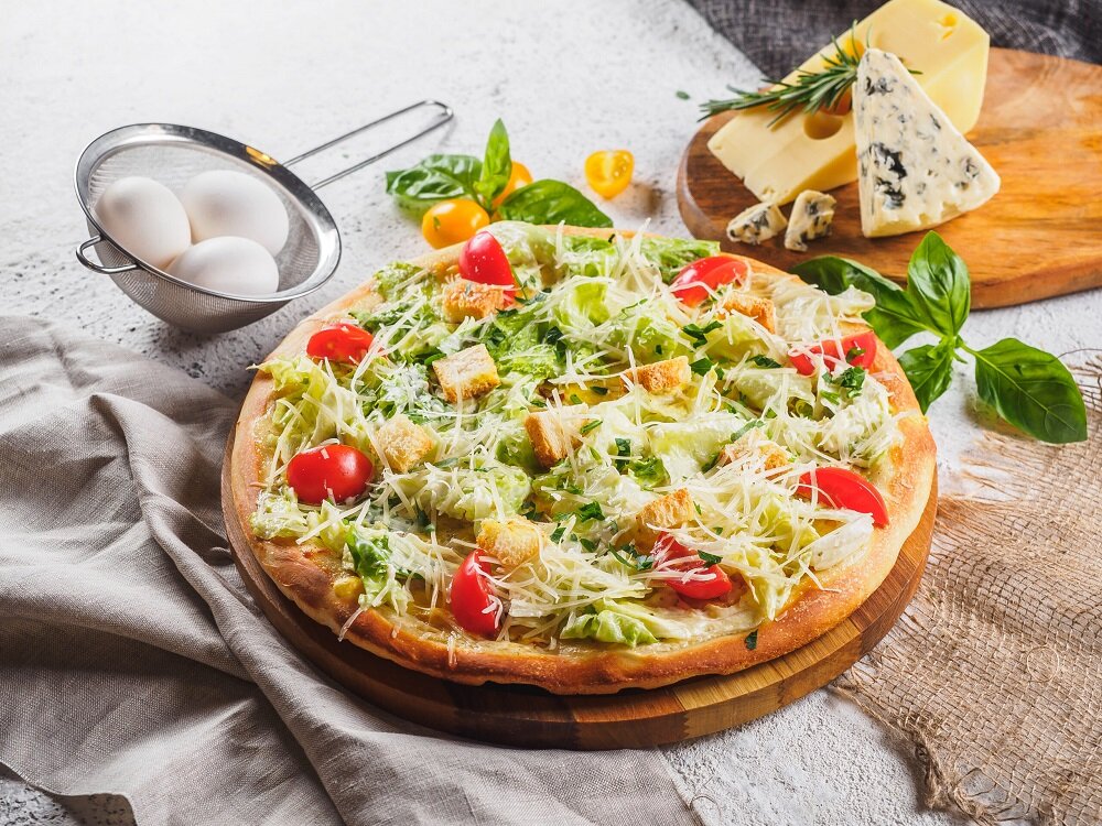 Домашняя пицца «Цезарь» с сочной курицей и листьями салата