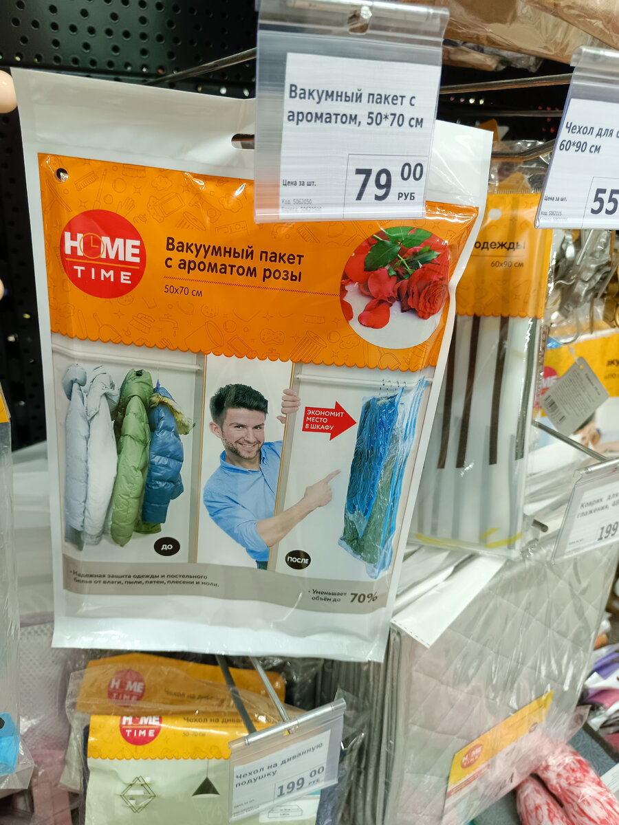 Вакуумный пакет с ароматом роз для упаковки вещей на летний период, размером 50/70 см. Цена 79 рублей. На упаковке есть подробная инструкция.