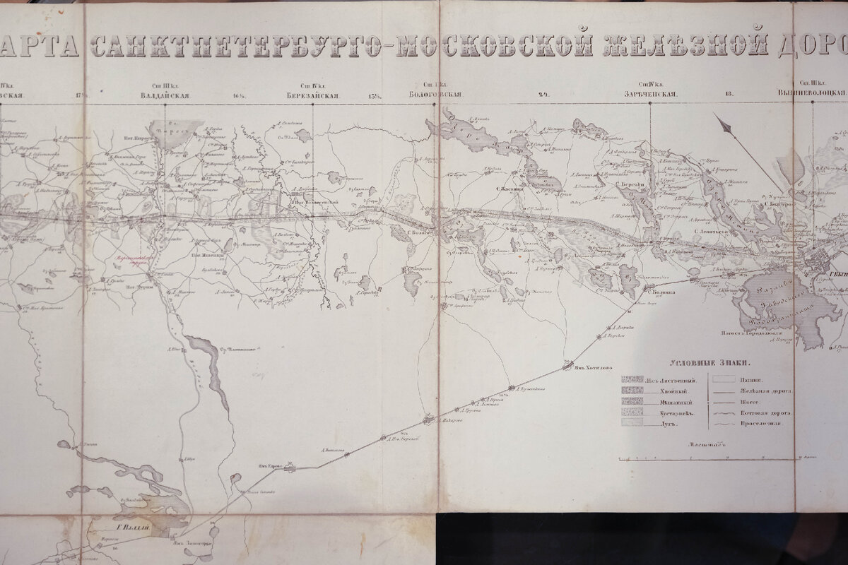 Удивительно интересный предмет пришел к нам недавно на реставрацию. Это была карта Санктпетербурго-Московской железной дороги 1851 года. На первый взгляд компактная, карта в длину достигает 3 метров! С поразительной детализацией указаны все железнодорожные пути на участке от Петербурга до Москвы. Карта для компактного хранения или транспортировки складывается в маленькую книжечку – из-за этого самыми уязвимыми местами, как часто бывает в подобных случаях, стали места сгибов – именно они более всего пострадали от времени. Работу (подробнее за ходом реставрации можно посмотреть в видео) мы начали с обеспыливания. С помощью нескольких ластиков разной степени жесткости и кисти мы удалили грязь с поверхности карты. Особенно бережно работали с лицевой стороной – на карте были еле заметные надписи карандашом, которые важно было сохранить. Далее убрали скотч, восстановили утраты и отреставрировали дефекты. Вернули на место полностью оторвавшийся фрагмент карты с Москвой. Затем произвели тониро