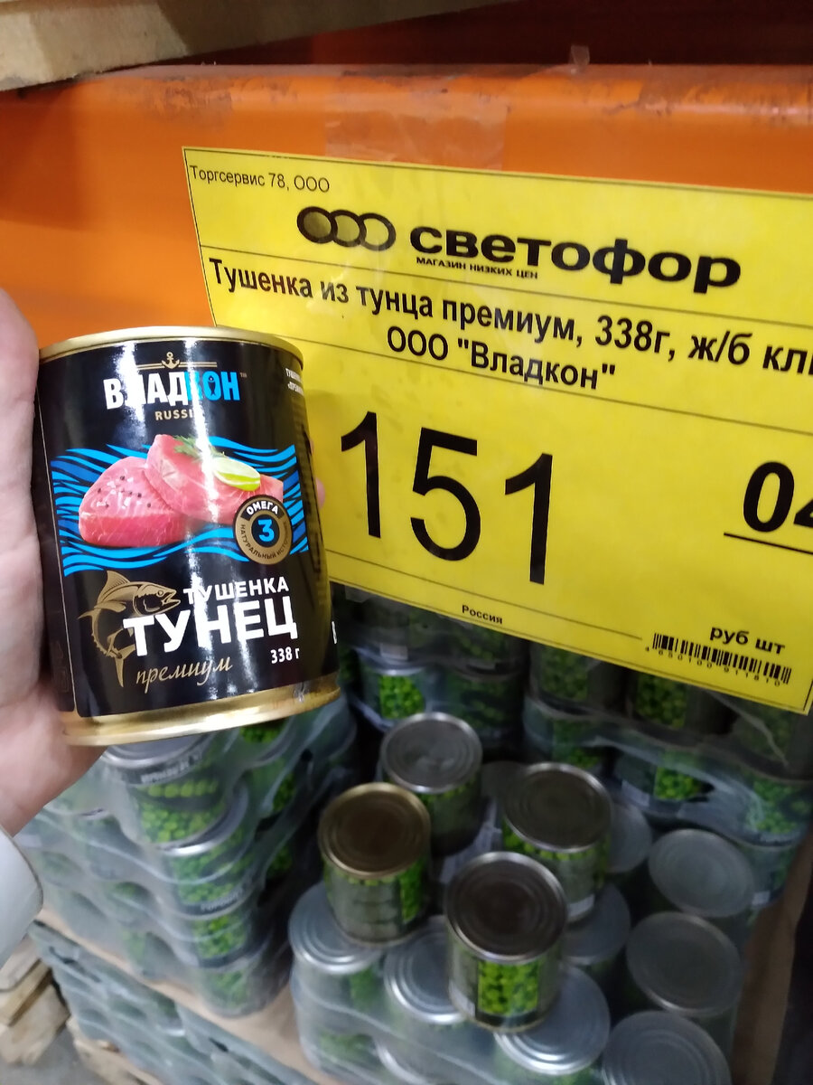 Зачастила я в Светофор. А почему бы и нет. Ассортимент магазина мне нравится, товар выбираю тот, который мне нужен. Сейчас не до жиру, надо денежки поберечь, а цены в этом магазине ниже, что меня устраивает. Что касается качества товара, замечу, что на некачественный товар можно нарваться и в дорогом магазине. Цена еще не показатель качества и отличных свойств продуктов. Сегодня смотрим консервацию. Никогда не знала, что тушенку можно приготовить из рыбы. Оказывается существует тушенка из тунца. А еще существуют колбаски жареные из горбуши и хамсы. Это для меня тоже открытие. Я знаю про котлеты из рыбы, теперь узнала про колбаски. Семга, кусочки натуральные. Большая банка всего за 73 рубля. Кто пробовал? Вот эту фасоль брали упаковками. Оказывается из нее варят суп. Сама по себе фасоль вкусная, и в салате и в супе. Эту банку я купила. Сварила борщ. Использовала содержимое банки в качестве заправки. Суп получился вкусный. Будут брать. Свинина тушеная ГОСТ. Увидела как одна семейная пара