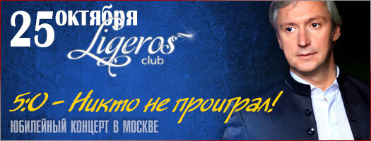 Дорогие друзья! 25-го октября 2019 года, в 19:00, приглашаю всех своих друзей на юбилейный вечер «5:0 – Никто не проиграл!» в самом центре столицы, в Ligeros-Club! Не пропустите этот уникальный концерт! Будет всё: звёздные гости, прекрасная атмосфера, море шампанского и заодно отметим моё День рождения!!! :))) И, конечно же, я спою все свои самые лучшие песни!!! Жду вас в гости! Заказ столика: +7(499)394-09-48,