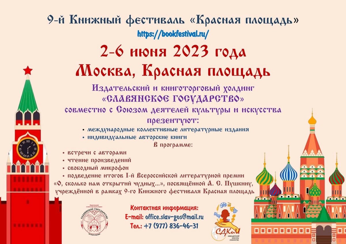Сайты slav-gos.ru, sdkii.ru https://bookfestival.ru/ 2–6 июня 2023 года Москва, Красная площадь Издательский и книготорговый холдинг «СЛАВЯНСКОЕ ГОСУДАРСТВО» совместно с Союзом деятелей культуры и искусства презентуют: • международные коллективные литературные издания • индивидуальные авторские книги В программе: • встречи с авторами • чтение произведений • свободный микрофон • подведение итогов I-й Всероссийской литературной премии «О, сколько нам открытий чудных...», посвящённой А. С. Пушкину, учреждённой в рамках 9-го Книжного фестиваля «Красная площадь» Контактная информация: E-mail: office.slav-gos@mail.ru Тел.: +7 (977) 836-46-31