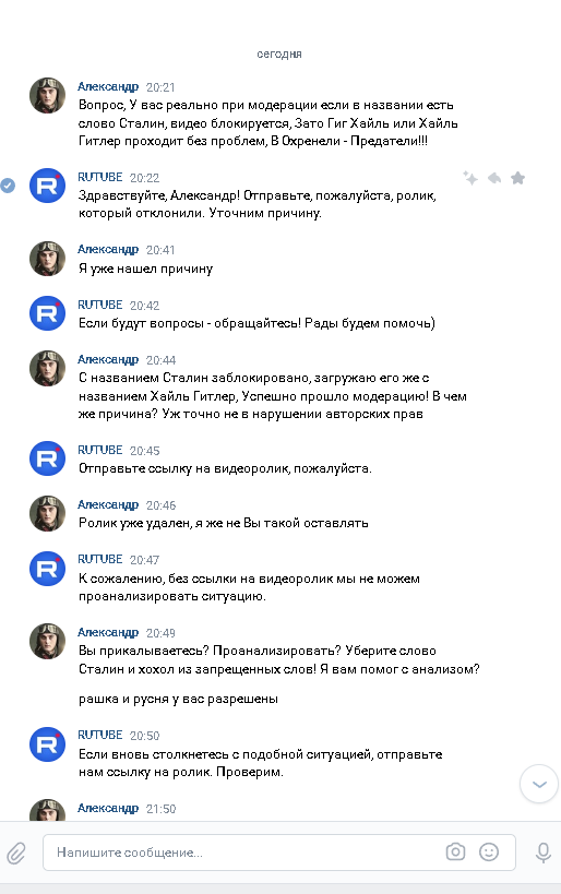 На кого работает РУТУБ? Интересная история произошла у меря с Рутубом! Загрузил видео с названием: Почему от Сталина отвернулась вся страна? И в результате ролик был заблокирован, Решил проверить, Загрузил то же видео с названием Хайль Гитлер и не поверите, Ролик успешно прошел модерацию!!! Привожу в пример скрины с перепиской с рутубом в контакте! У Меня один вопрос: На кого работает РУТУБ?