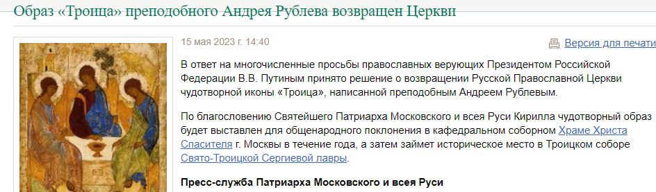 Народ, здравствуй. Я, конечно, не специалист по хранению древних шедевров искусства, но полагаю, что именно в музеях созданы специальные для них условия (температура, влажность, свет и пр.). Там же и эксперты, реставраторы, хранители, искусствоведы, которые следят за ними и поддерживают их жизнь. Кроме того, я не понимаю, как такие вопросы, как взять из государственного музея и передать кому-то, в данном случае РПЦ, признанный шедевр искусства по решению Путина. Взял Путин и отдал что ли? Может ли президент это делать? Однако, кажется, так и получается: икону "Троица" Рублева Путин разрешил передать РПЦ. Во всяком случае, так написано на их официальном сайте. В ответ, якобы, на многочисленные просьбы верующих. Есть ли условия для хранения и поддержания иконы в Храме Христа Спасителя? Помимо "Троицы" Андрея Рублева РПЦ получила из Эрмитажа Раку Александра Невского (серебряную гробницу русского полководца), правда, по документам в аренду на 49 лет. Тоже Путин, видимо, велел. Иначе как