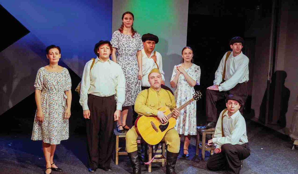 И в этом «хоре» есть другие партии – матери, жены, дети; боевые подруги – связистки, медицинские работники. Удачно режиссерское решение сделать этот голос «живым»: песни военных лет исполняют под живой гитарный аккомпанемент. Интересен также ход некого «отстранения», когда тюзовцы не играют известных артистов, а выступают просто рассказчиками. Это гармонизирует спектакль изнутри, ведь если поставить перед актером задачу сыграть Никулина или Смоктуновского, то зритель волей-неволей будет искать похожести и различия в создаваемых образах. А достоверность передачи личностных особенностей – не задача этого материала.