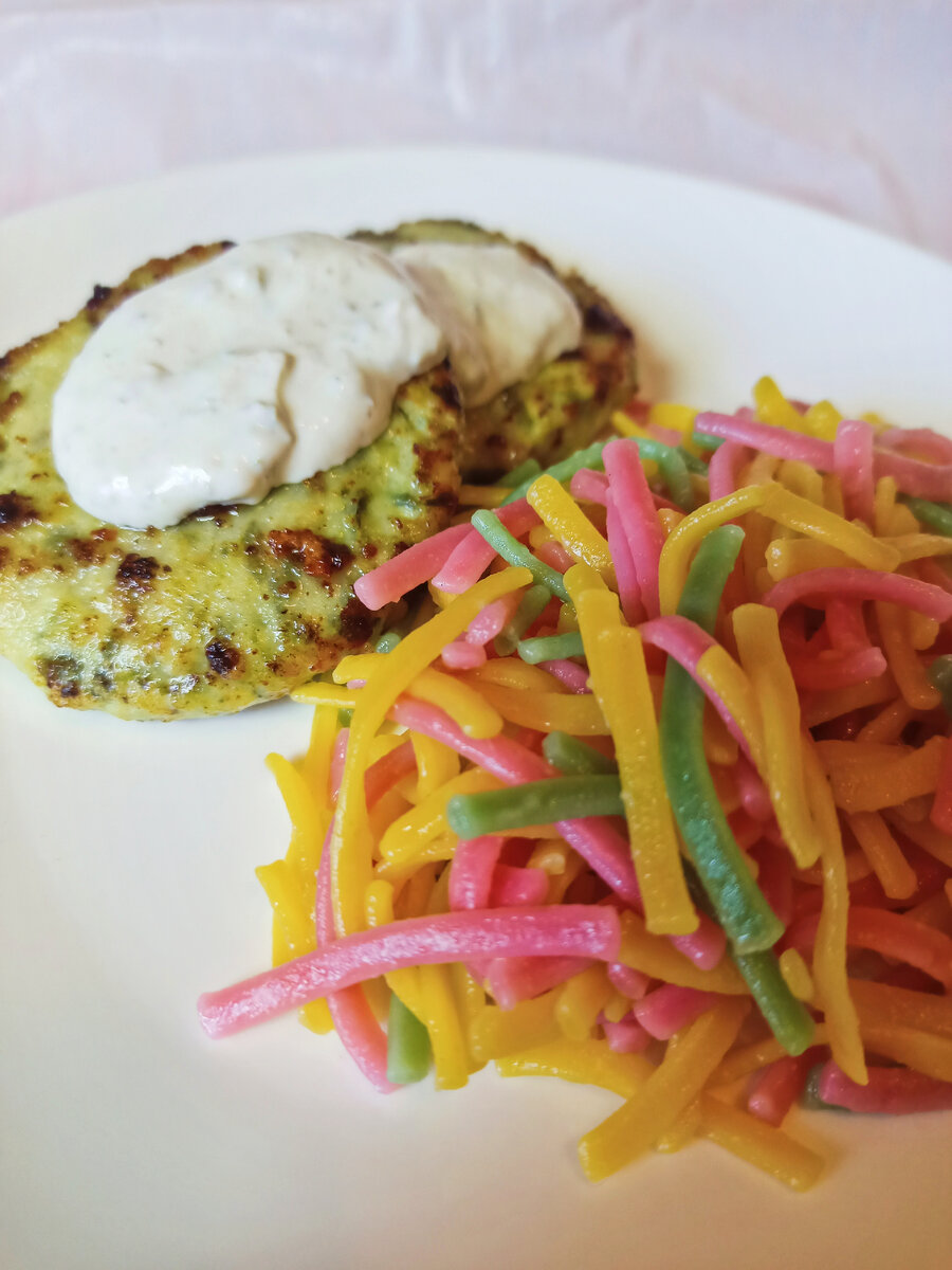 Как сделать еду на тарелке ярче? Просто добавляем зелень! Итак, что нам понадобится на котлеты: 700 гр. Куриного филе 200 гр. Зелени Соль и перец по вкусу У меня зелёный лук и шпинат, хорошо получается с петрушкой, но не рекомендую добавлять укроп, у него очень яркий вкус и он перебьёт вкус курицы. Прокручиваем на мясорубке филе вместе с зеленью и получаем яркий фарш) А знаете как я делаю котлеты одинакового размера и формы? Использую крышки! Обычную крышку оборачиваю пищевой плёнкой и накладываю в неё фарш, а потом просто переворачиваю) И обязательно обваливаю в муке, сухарях или манке, чтобы "запечатать" сок внутри и котлеты были сочнее. Итак, котлеты сформированы, просто обжариваем их на среднем огне с каждой стороны. В подаче использована лапша со свёклой и шпинатом, чтобы поддержать зелёную тему и соус из сметаны с аджикой по этому рецепту: Приятного аппетита! 😋 #котлеты #еда #рецепт #рецепты #готовим #вкусно