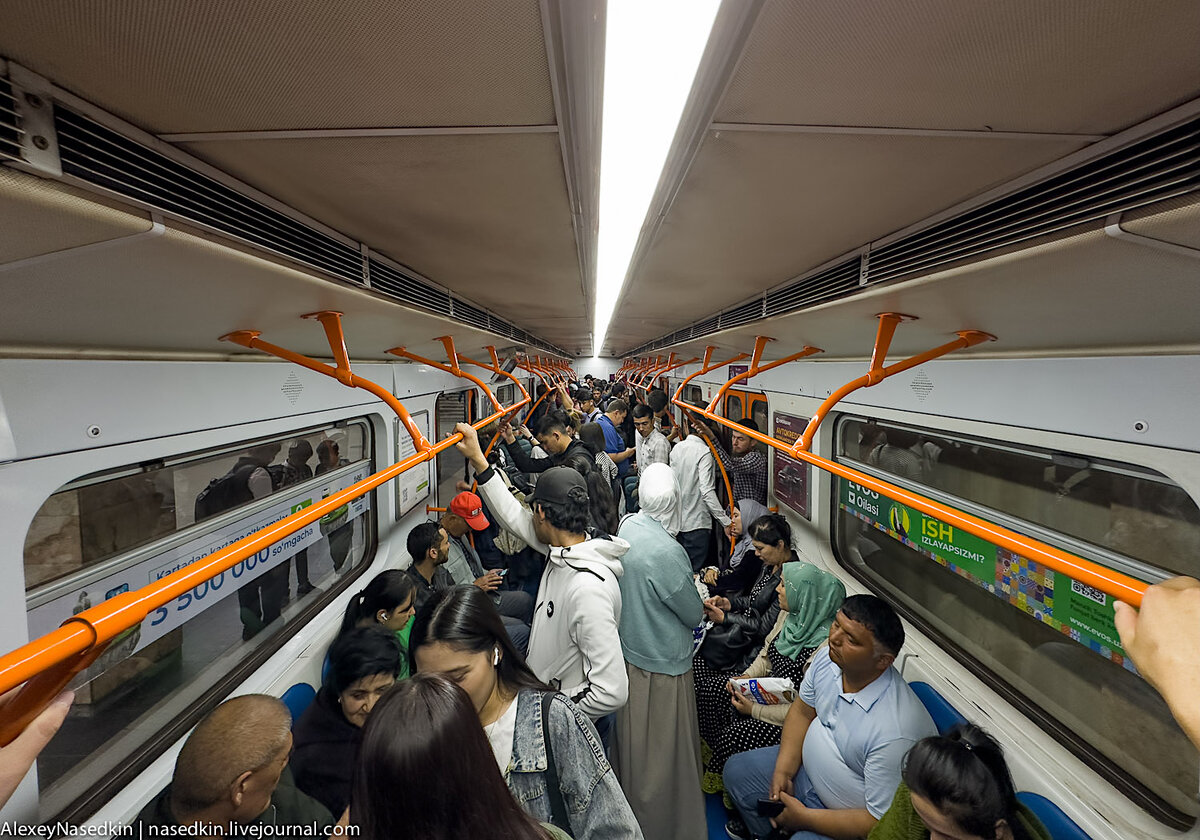 И ведь не сказать, что как-то уж очень редко спускаюсь в подземку. Бывает, и довольно часто, в безнадежных усилиях хоть как-то побороть вязкие автомобильные пробки. А тут прямо невозбранное удивление совершенно новым колоритом, с лихвой перекрывающим даже московские курбанбайрамовские телодвижения в районе Сухаревки. Ладно, так и быть, никакие это не мигранты. Они у себя дома. Итак, добро пожаловать в ташкентский метрополитен. Но для начала его нужно ещё и найти, а в подобных тёмных коридорах безо всяких указателей, данное действие затруднительно. Тем не менее, вход найден и сразу настроение каких нибудь 90-х или начала двухтысячных. Кассы в метро Ташкента, (открытого, кстати, в 1977 году и ставшего седьмым по счёту в СССР) выглядят так. Ещё в 2020 году в качестве оплаты использовались жетоны, но сейчас перешли на современные бумажки с QR-кодом, которые нужно приложить к валидатору. И между прочим, проезд стоит всего 12 наших рублей! Строгости добавляет разве что неминуемый шмон местны