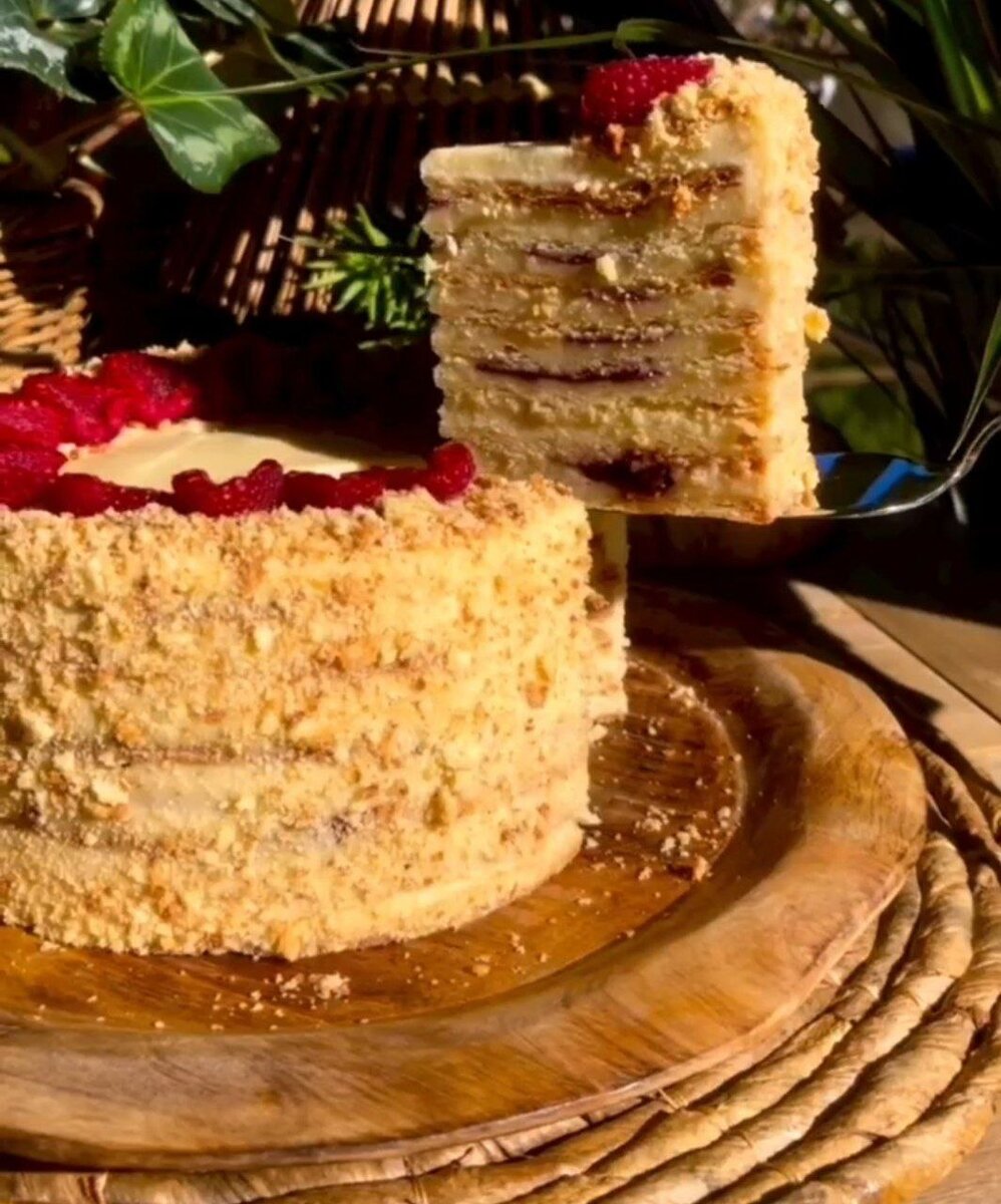 Настоящий «Наполеон», простой в приготовлении! Тесто: Сметана - 200 гр., Сливочное масло - 200 гр., Мука - 500-600 гр., Щепотка соли, Ваниль. Крем: Молоко - 350 мл., Сахар - 150 гр., Ваниль, Желтки - 6 шт., Крахмал - 2 ст.л., Мука - 2 ст.л., Масло сливочное - 200 гр. Свежая малина - 200 гр. Сливочное масло разминаем,добавляем сметану, щепотку соли, перемешиваем. Далее в 3 приема вводим муку и замешивааем тесто. Тесто делим на 8 частей, аккуратно формируем шарик, выкладываем в емкость, оборачиваем пленкой и убираем минут на 40 в холодильник. Берем шарик теста, раскатываем на пергаменте, без муки. Далее вырезаем круг по размеру будущего торта,например, по какой-то тарелке. Тесто обязательно потыкайте вилкой,чтобы не вздулось при запекании. Борта обрезанные также оставьте выпекаться, из них будем делать посыпку. Далее выпекаем 6-7 минут/190 градусов! Готовим крем. Берем кастрюлю с толстым дном и ставим на мелкий огонь. Выливаем желтки,мешаем венчиком, сахар и снова мешаем. Далее чу