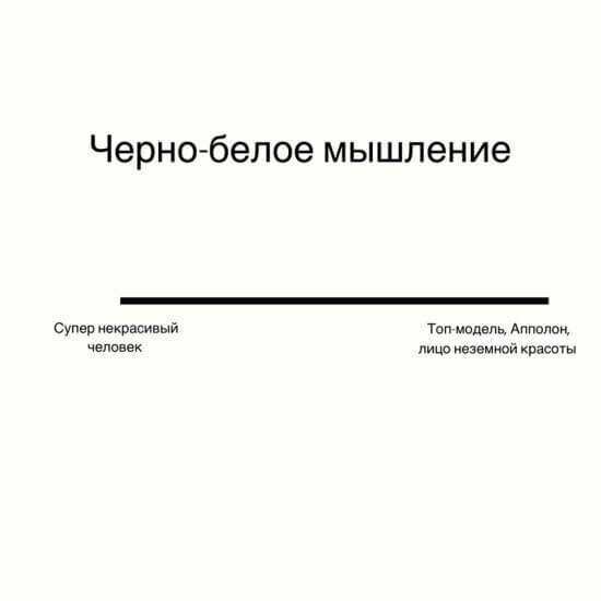 Черно-белое мышление / расщепление / дихотомия - вид искажения мышления при котором, человек делит мир ровно на положительное и отрицательное, хорошее или плохое, все или ничего. Примеры такого вида мышления: и так далее. Причины черно-белого мышления: 1) психическое заболевани (ПРЛ, депрессия, БАР, СДВГ, ОКР и др.) 2) Категоричность - как манипуляция (Либо я - либо она!). 3) Перекладывание ответственности (ты же знаешь, что все мои проблемы из-за того, что я скорпион!). 4) Недостаток опыта. Человек, у которого мало опыта в определенной области, может прибегать к черно-белому мышлению, так как не всегда способен оценить все возможные варианты и нюансы. Такой тип мышления свойственен молодым и (не всегда молодым) инфантильным людям. 5) Эмоциональное состояние - стресс, хроническая усталость, тревога, гнев. Когда разум не может мыслить хладнокровно и рассудительно, тогда и используются максимально упрощенные способы совладания с собой и ситуацией. 6) Негативный опыт в прошлом - для тог