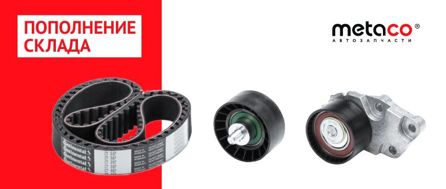 На склад поступили запчасти для ремонта ГРМ: различные ролики, ремни и полные комплекты Metaco. В новой поставке 63 артикула, в числе которых 25 новинок. 18 из них — новые комплекты ГРМ.