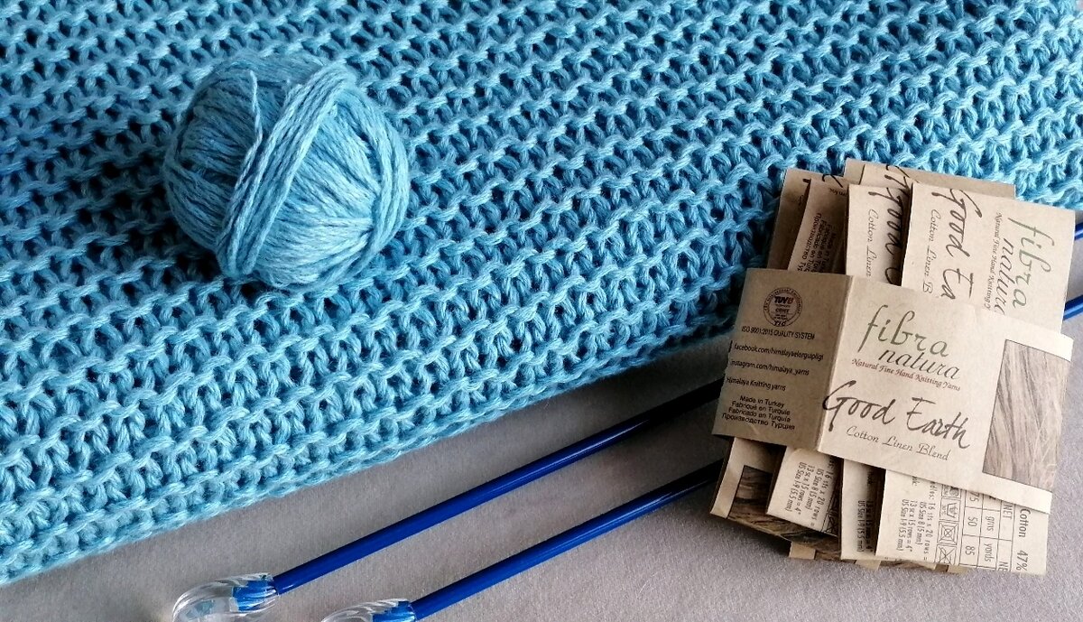 Как правило, я не люблю вязать одинаковые вещи. Зачем повторяться, если в голове так много идей, что одна отталкивает и опережает другую... Но именно "кольчуги" сподвигли меня на такой вязальный "подвиг"... Первую я подарила сестре. Вторую - прекрасной милой девушке. Вот и пришлось мне колупать третью. Небесно-голубую... Пряжа - турецкий хлопок со льном. Ниточка суховатая, довольно толстая. Это мне очень нравится, так как полотно выигрышно выглядит в моей любимой платочной глади. Пряжа пришла мне из магазина Паквул. Вот видео-распаковка посылки из данного магазина. В ролике я показываю некоторые цвета данного артикула. Они все очень красивые, природные. На канале есть и отдельное видео по обзору данной пряжи. На лето - это просто прелесть! Натуральный состав обеспечивает уют и комфорт. Изделие я вязала спицами 5,5. Две одинаковые половинки связаны легко и просто. Набрала 100 петель и связала вверх 64 "дорожки" платочной вязкой. Далее для скоса плеч закрыла с каждой из сто