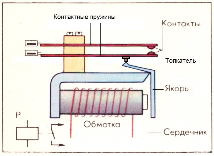 Реле - устройство, в общем-то, нехитрое. Электромагнит и якорь - сделанный из стали изогнутый двуплечий рычаг. При пропускании тока через обмотку нижнее плечо якоря притягивается к сердечнику. Якорь слегка поворачивается и своим верхним плечом через толкатель из изоляционного материала нажимает на подвижный контакт, прижимая его к неподвижному.