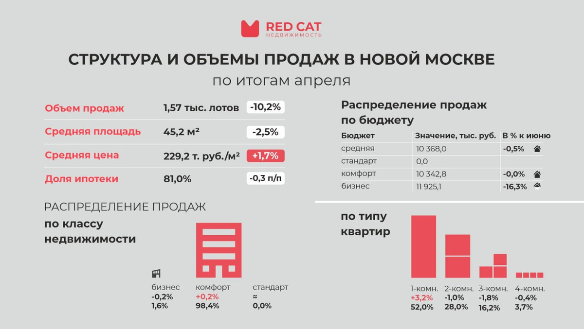 · В апреле территория Новой Москвы оказалась лидером по темпам снижения спроса – продажи сократились на 10,2%, отойдя от локального максимума марта, и составили 1,57 тыс. лотов. · В прошлом году в апреле началось стремительное падение объемов продаж в Новой Москве – тогда за месяц число сделок рухнуло на 45,5%, за прошедший год спрос так и не восстановился. Текущие показатели чуть превышают уровень прошлого года (+3,0%), но разница с апрелем 2021 года составляет -37,0%, и даже продажи в допандемийном 2019 году были выше текущих на 36,6%. · В структуре спроса по классу жилья отмечались незначительные колебания, в сегменте бизнес-класса покупатели были чуть менее активны, поэтому спрос снова сместился в сторону доступных проектов. Так 98,4% (+0,2 п/п) всех сделок в Новой Москве приходится на новостройки комфорткласса, доля бизнес сегмента, снизилась на 0,2 п/п до 1,6%, продаж новостроек стандартного класса в апреле зафиксировано не было. · В апреле в Новой Москве спрос на однокомнатные