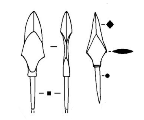 Продолжаем мини-курс о редких и нетипичных наконечниках стрел, найденных в регионе близ Золотаревского городища, в Примокшанье и Посурье. Там, где в X-XIII веках пересекались ареал обитания мордовских народов - и фронтир Волжской Булгарии. Плоские наконечники с утолщенным бронебойным острием Не то чтобы сверх-редкий, но достаточно своеобразный тип наконечника, призванный соединить свойства плоского ромбовидного или треугольного - в нанесении широкой раны, со свойствами усиленного бронебойного - в поражении противника сквозь броню, соответственно. Вот два характерных наконечника: Да, это два, а не три. Первый представлен в двух проекциях, чтобы была хорошо заметна уплощенная средняя часть, "тело", - и развитая граненая "боеголовка". Первый наконечник - из Васьканьсада. Полная длина - 77 мм (вместе с черешком), пера - 51 мм, ширина - 19 мм. Острие - ромбического сечения, гораздо толще "тельца". Второй наконечник, подтреугольный - из Чемодановского селища. Полная длина - 70 мм, пера - 42