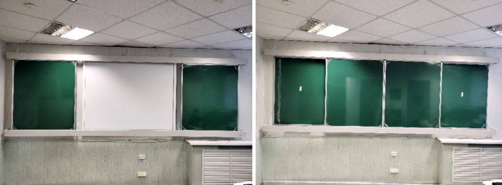 1. Раздвижная рельсовая система позволяет оптимизировать рабочее пространство в классе, а также позволяет школьникам принимать активное участие в процессе обучения и открывает новые возможности для презентации проектов, рефератов и домашних заданий. Раздвижная рельсовая система состоит из 4-х или 2-х поверхностей, две/одна фиксируются к стене и две/одна свободно перемещаются по рельсовой системе перекрывая установленную в центре интерактивную панель диагональю 65/75 дюймов. Система может комплектоваться различными комбинациями поверхностей: как меловыми, так и маркерными. Металлическая основа доски позволяет крепить к ней учебные наглядные пособия при помощи магнитов.