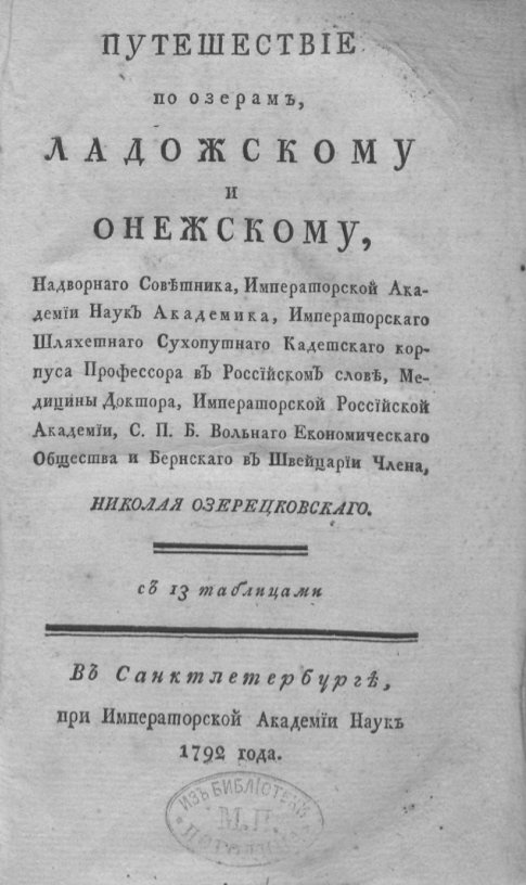 Летом 1785 года Академия направила Н. Я. Озерецковского в экспедицию по Ладожскому и Онежскому озерам. К этому времени он уже признанный ученый-натуралист, разносторонне образованный деятель и опытный исследователь.