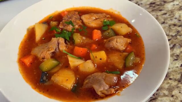 Для данного рецепта сковороду лучше взять с высоким бортиком, ведь здесь вместе с овощами мы сразу приготовим ароматный соус. В высокой посуде такое блюдо будет удобнее перемешивать. 🔥 Лучшее в телеграм: Посмотреть Ингредиенты: Способ приготовления: Шаг 1. Подготовьте курицу. Промойте и срежьте с костей мясо. Картофель нужно очистить и нарезать на крупные кубики. Точно так же нарежьте кабачок. Морковь — мелким кубиком. Крупно порежьте лук. Шаг 2. Разогрейте сковороду с растительным маслом. Кусочки мяса положите в раскалённое масло и обжарьте. Сразу добавьте соль. Шаг 3. Когда на кусочках мяса появится корочка, добавьте в сковороду лук и измельченные зубчики чеснока. Обжаривайте при высокой температуре, сразу можно добавить специи чтобы курица хорошо впитала в себя их запах и вкус Шаг 4. Через несколько минут добавьте томатную пасту или нарезанные помидоры. Как только она перемешается, можно добавить остальные овощи — кабачки с морковью. Шаг 5. Залейте блюдо горячей водой. Обратите вни