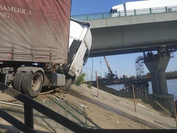 На записи видно, как водитель грузовика, подъезжая к мосту, резко сворачивает. Транспортное средство пробивает отбойник и металлический забор, после чего буквально зависает над рекой. По словам очевидцев, к водителю тут же побежали несколько граждан, которые помогли ему выбраться из большегруза. После аварии на участке образовалась пробка.
