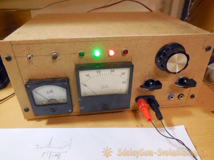 Подстроечный резистор необходим для настройки коэффициента усиления, в большинстве случаев его достаточно оставить в среднем положении (примерно 20-25 кОм). Стрелочная головка подключается через галетный переключатель, с помощью которого можно выбирать один из трёх подстроечных резисторов, с помощью которых задаётся ток максимального отклонения амперметра. Таким образом, амперметр может работать в трёх диапазонах – до 50 мА, до 500 мА, до 5А, это обеспечивает максимальную точность показаний при любом токе нагрузки.