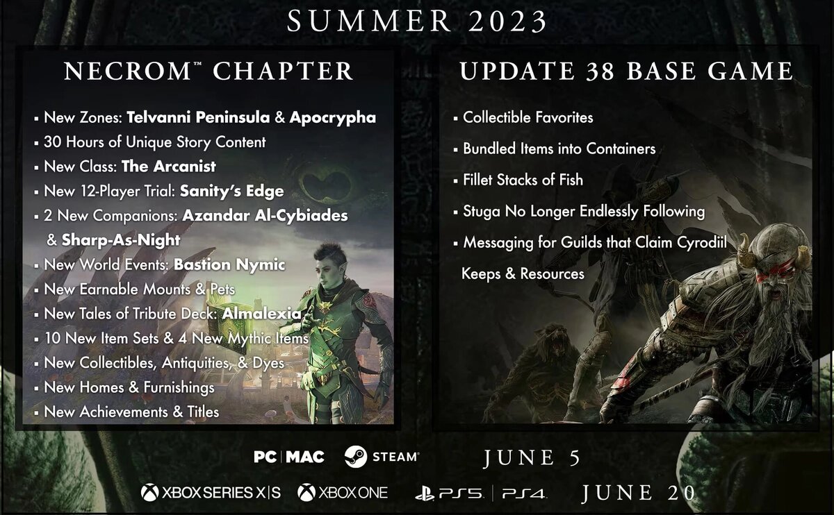 Обновление для MMORPG The Elder Scrolls Online: Necrom почти готово, и ZeniMax наконец-то раскрыла полный список функций и предложений для предстоящей главы и сопутствующего обновления базовой игры. Как сообщалось ранее, новая глава будет включать в себя около 30 часов сюжетного контента, действие которого будет происходить в двух новых зонах: на полуострове Телванни и в даэдрическом царстве Апокрифы. Кроме того, игроки смогут пройти пробную версию Sanity’s Edge, собрать двух новых компаньонов и принять участие в мировом событии Bastion Nymic. Necrom будет выпущен вместе с бесплатным обновлением 38 для базовой игры, которое представит коллекционные фавориты и устранит надоедливую привычку Стуги следовать за вами по всему Тамриэлю. Релиз обновления назначен на 5 июня.