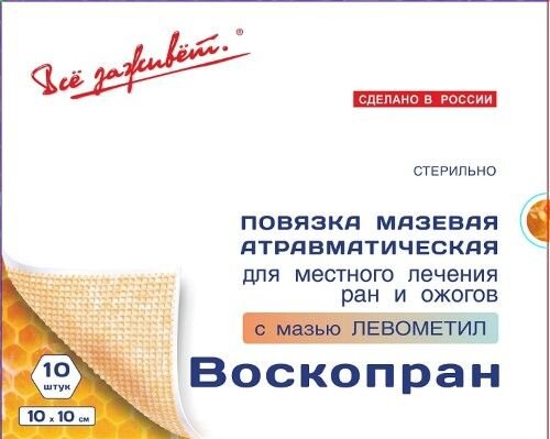 Воскопран с мазью Левометил - Стерильная сетчатая повязка, пропитанная пчелиным воском и мазью, активно стимулирует процесс заживления. А так же обеспечивает продолжительное противомикробное и сорбционное действие, что необходимо особенно при долгосрочном ведении раны. Показания: