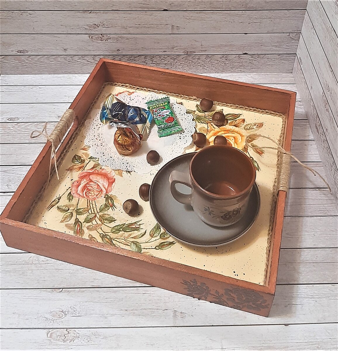 Эта деревянная заготовка могла стать чем угодно - органайзером для канцмелочей, сухарницей, конфетницей, но я увидела в ней поднос, стоящий на столике в летнем саду. Над головой шелестят зеленые кроны, день клонится к закату, и ароматный травяной чай в чашках дарит отдохновение и располагает к задушевной беседе. Дожидалась своего часа заготовка довольно долго, я приобрела поднос в Ашане еще прошлой весной: Декорировать будем, снова прибегая к классическому декупажу. Не хочется сложностей))). Зашлифовав неровности наждачной бумагой, грунтуем белым акрилом дно подноса только с внутренней стороны: После просушки клеем ПВА приклеиваем цветочный мотив из декупажной салфетки: Все остальные стороны (бортики и внешнее дно) покрываем морилкой в два-три слоя с промежуточной сушкой и шлифовкой: Мне очень нравится в предметах видимая структура дерева, поэтому старюсь сохранить её, не окрашивая, а лишь подчеркивая морилками. Но это удается в тех случаях, когда заготовка качественная и цельная, а н