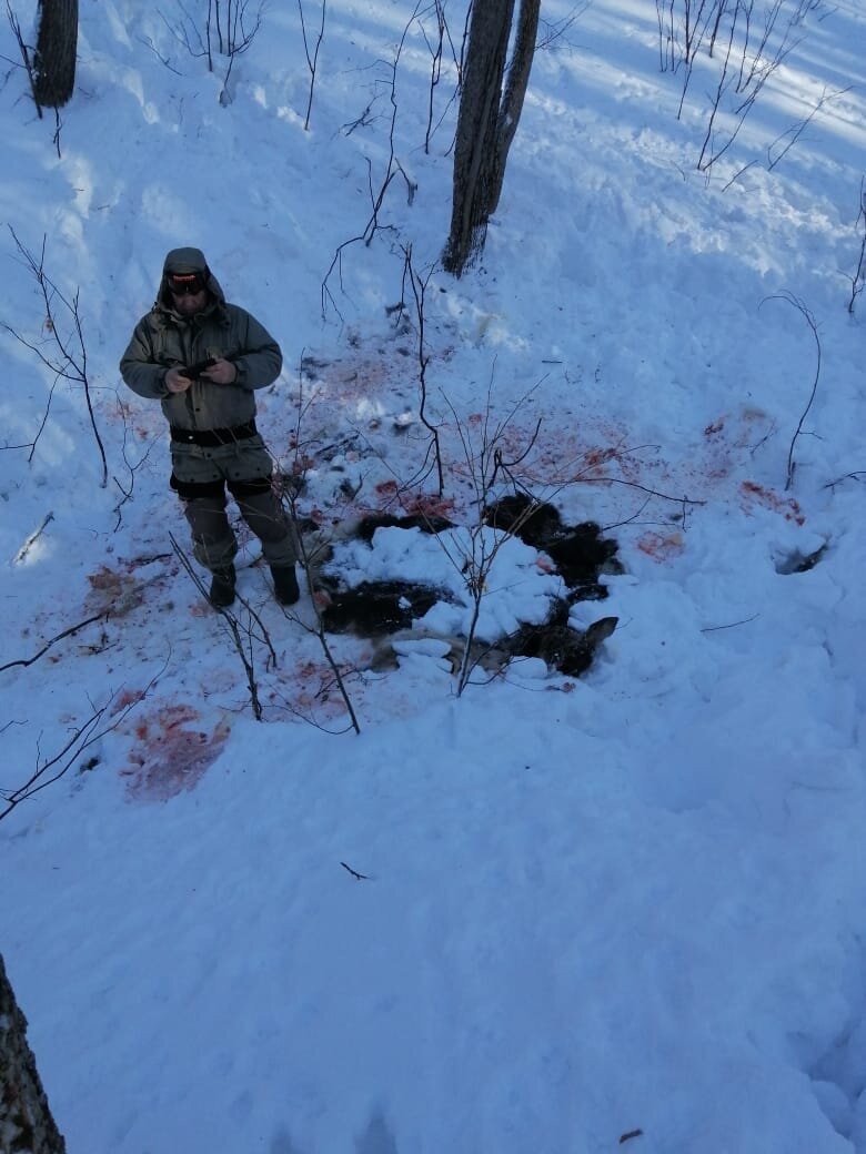 9 января 2022г. производственные охотинспектора Ассоциации охотников и рыболовов РБ руководитель Кугарчинского райотделения Иванов Е.В. и егерь Бобровский Ю.Л. совместно Госохотинспектором Минэкологии РБ Чижковым С.А. как обычно осуществляли на снегоходах очередной рейд по закрепленным за Ассоциацией охотугодьям. В ходе рейда охотинспекторами был обнаружен совмещенный след лошади и лыжника. На всем пути их движения по снегу тянулся кровавый след, который предполагал что лошадь, была навьючена тяжелым грузом. Зная, что на данный день никто из охотников не регистрировался и не сообщал в Кугарчинское райотделение о своем выходе на охоту, инспектора сразу поняли - это браконьеры, причем, судя по следам на снегу, их было двое. Обнаружив место отстрела и разделки животного, а им оказалась лосиха с двумя эмбрионами, о факте совершенного браконьерства было незамедлительно сообщено в службу «112», по сигналу которой своевременно прибыла оперативная группа ОМВД России по Кугарчинскому р