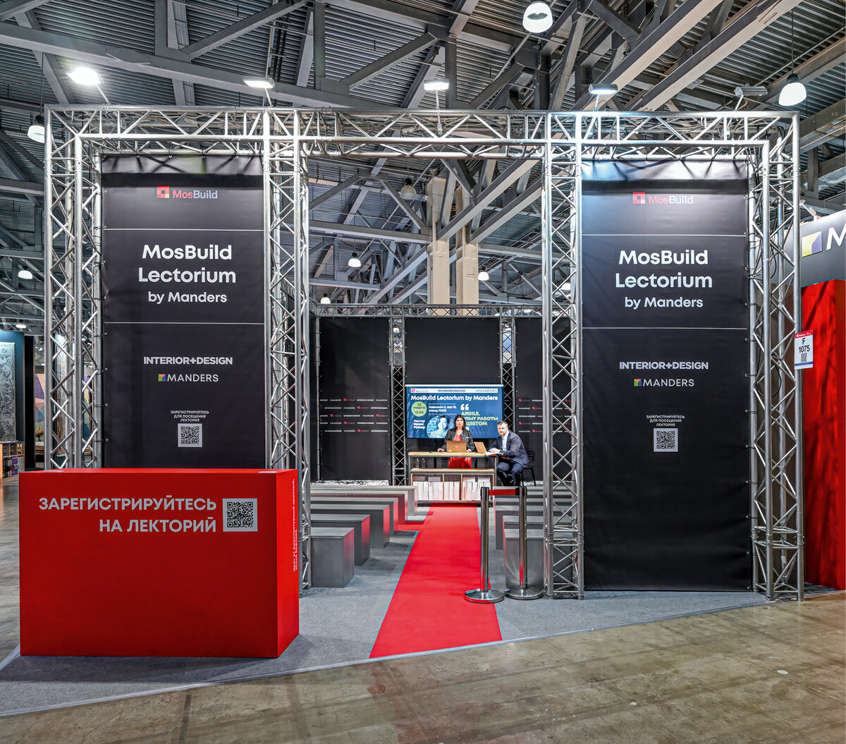 В этом году стенд Manders на выставке Mosbuild был особенно стильным. И неспроста: его планировкой занималась архитектор Софья Инфанте. Размышляя над концепцией стенда, девушка понимала, что задача перед ней стоит вовсе непростая. Стенд должен был прежде всего отвечать всем поставленным заказчиком задачам экспозиционного стенда Чтобы воссоздать столь любимую мастером поверхность бетона, арки были покрашены в светло-серый оттенок Grace из Архитектурной палитры Manders, автор которого – известный российский архитектор Тотан Кузембаев. А в лучших традициях Баухауза ребра арок были подчеркнуты другим оттенком. Для этого пригодилась новая Архитектурная палитра от Manders и золотисто-охристый цвет 24 «Смола памяти», созданный архитектором Александром Ермолаевым. Звонкий красный оттенок 37 «Архитектурный красный» архитектора Юлия Борисова был использован для акцентных элементов. Внешний фасад был решен как функциональная витрина с ячейками единого размера. Для него был использован яркий свежи