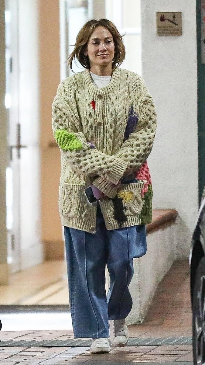 Для вечерней прогулки Дженнифер Лопес выбрала простой, но стильный аутфит. Она надела базовую белую футболку и широкие джинсы с наружным швом посреди штанин. К ним она подобрала эффектный объемный кардиган с инфантильным декором — вышивками, напоминающими цветы. Дополнила она выход классическими кедами и серьгами-кольцами. Читайте также на нашем сайте: Подписывайтесь на нас в Телеграме, чтобы быть в курсе последних новостей!
