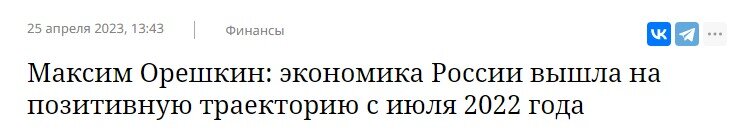 Выступая на федеральном марафоне "Знание", помощник президента РФ Максим Орешкин заявил, что российская экономика с июля 2022 года "вышла на позитивную траекторию". Вот цитата: С июля прошлого [2022] года наша экономика находится в состоянии становления и экономического роста. Сейчас мы видим, что достигнув минимальной точки в июне прошлого года, наша экономика встала на позитивную траекторию. То есть, по словам Орешкина, то самое "дно", которое все так любят искать, пройдено уже почти год назад. Странно, но никто этого и не заметил, в т.ч. и наша официальная статистика. Давайте смотреть. С июля 2022 года - это значит с 3 квартала 2022 года. Темпы годового прироста ВВП с июля 2022 года по март 2023 (последняя расчетная дата) КАЖДЫЙ месяц и КАЖДЫЙ квартал находятся в отрицательной зоне. То есть, роста все еще нет, есть только падение. Можно, конечно, обратить внимание, что в июне это падение в годовом выражении было самым сильным (-4,9%), а далее чуть слабее (-4,3 - 4,5%), но вы бы назв