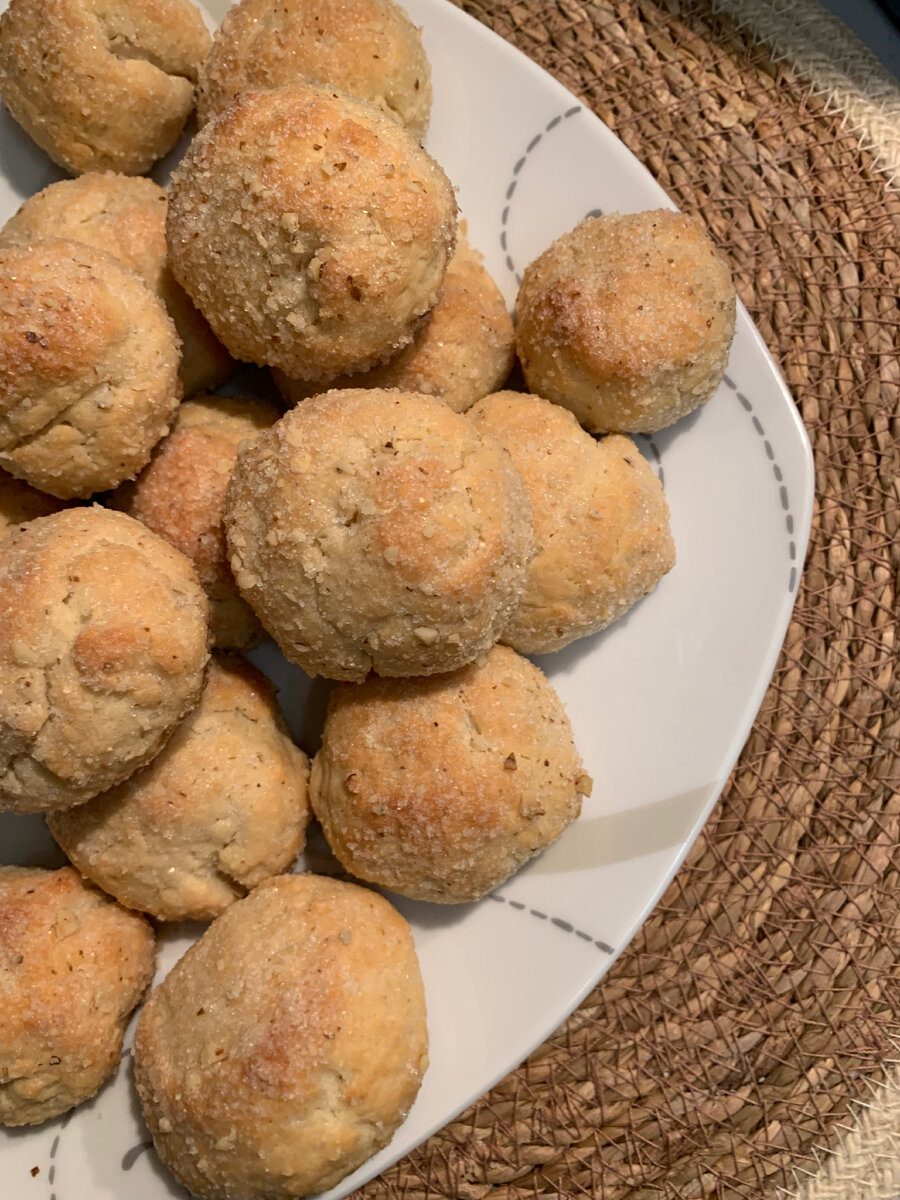 Соединяю: 250 г. творожный массы (или творога) 4 ложки сахара и яйцо перебиваю все ингредиенты блендером. в получившуюся массу добавляю подсолнечное масло 60г. и ложку ванильного сахара и перемешиваю лопаткой. Кокосовую стружку 20г. и муку примерно 200г. замешиваю в тесто Делю тесто на равные кусочки и катаю из них шарики Грецкие орехи рублю мелко и перемешиваю с двумя ложками сахара обваливаю шарики из теста в смеси сахара и орехов, выкладываю на пергамент и отправляю выпекаться при 180 градусах 15-20 минут. Скорее ставьте чайник и пробуйте вкуснейшее печенье 🍪 Приятного аппетита! Подписывайтесь на мой канал будем готовить вместе✨❤️