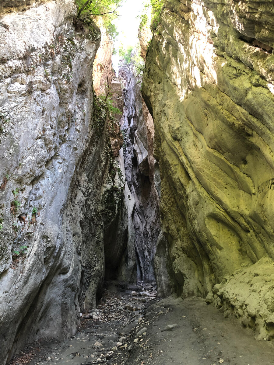 Сегодня отметим еще один пункт на карте Дагестана-Карадахскую теснину. Она является природной границей между двумя горными районами: Гунибским и Хунзахским. Ширина ущелья колеблется от двух до четырёх метров при высоте скал до 170 м, а протяжённость его самой узкой части составляет 400 м. Питание реки в ущелье происходит благодаря дождям, поэтому во время сильных дождей здесь образовываются водно-грязевые потоки. Они заполняют теснину на высоту до пяти метров, сметая всё на своём пути! Это очень опасно, поэтому экскурсия сюда во многом зависит от везения и метеопрогноза. Склоны здесь сложены известняками и глинистыми сланцами светло-жёлтого цвета. Поскольку эти породы непрочные, за десятки тысяч лет водный поток постепенно рассек камень и проложил через него своё русло. В XIX веке здесь была налажена добыча горючих сланцев. Именно поэтому теснину также называют Сланцевой. А еще ущелье называют «Воротами чудес» и «Бецъкварили», что в переводе с аварского означает «тёмное ущелье». Вид
