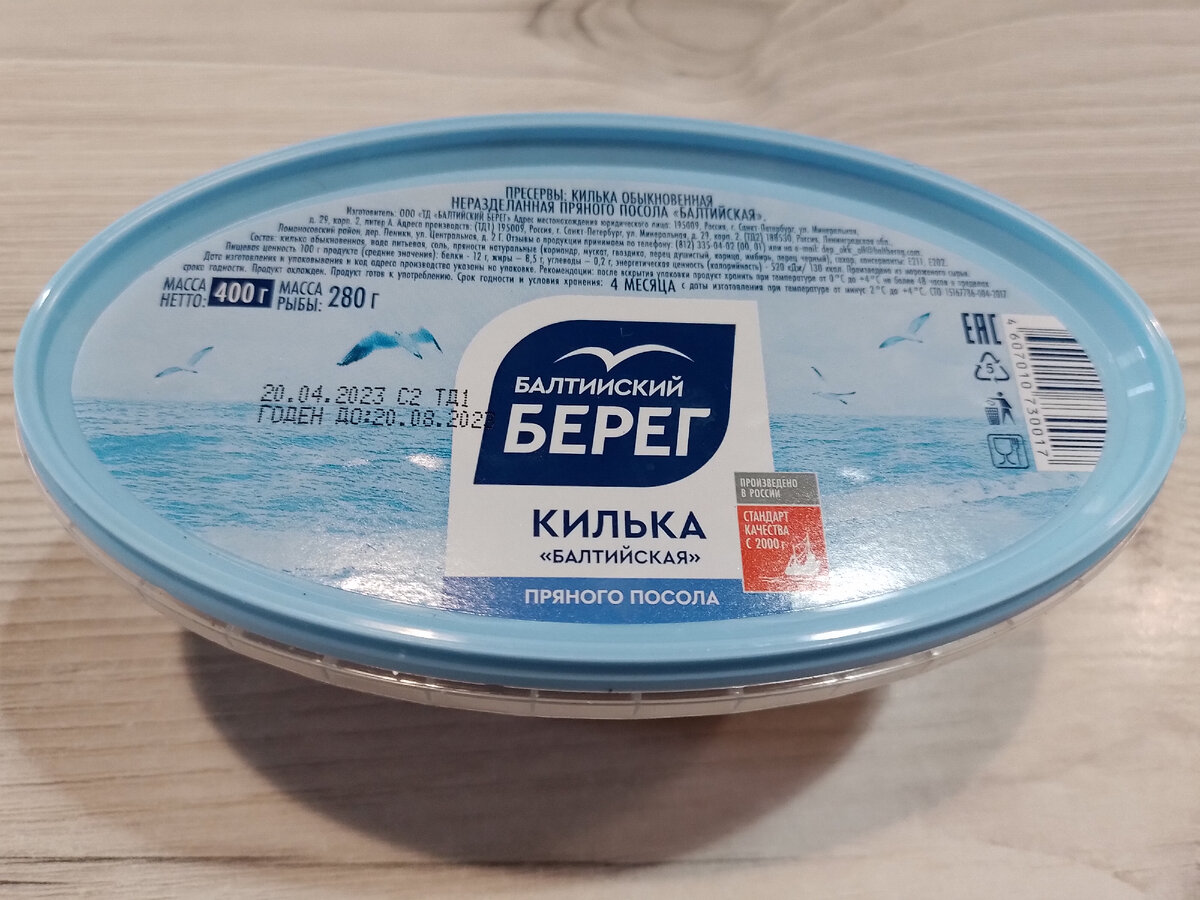 Мы с мужем рыбу любим любую и в любом виде. Периодически покупаем соленую кильку. С отварной картошечкой сплошное удовольствие. Последние 2 раза покупали кильку "Балтийский берег" в ГМ "Лента", хотя такая, наверно, везде продается. Цена за баночку 400 г сейчас 100 рублей. Состав: килька обыкновенная, вода, соль, пряности, сахар и консерванты.
