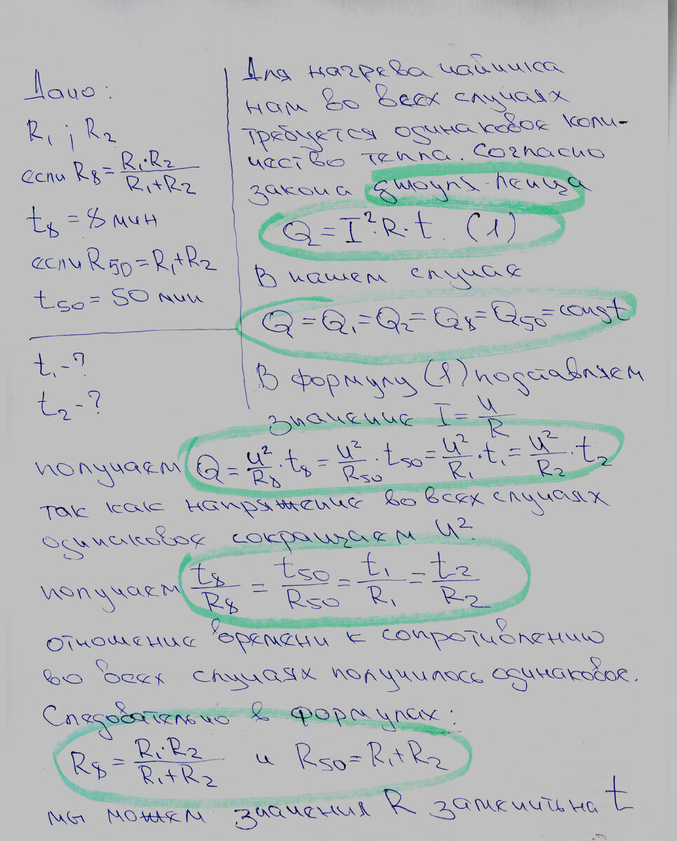 Задача которую я мучал больше двух недель. С точки зрения физики, задача простенькая, но каждый раз я упирался в математику, и каждый раз откладывал решение на потом. И вот настал момент, когда звёзды сошлись, время, энергия, желание и неудовлетворённое любопытство. К сожалению редактор в Дзене не позволяет вставлять формулы, поэтому большая часть решения у меня будет в виде сканов. Решение данной задачи, я искал в интернете. Те решения которые я нашёл, я смог понять, только после того, как сам рашил задачу полностью. И всё равно, есть ощущение, что получилось немного криво((( Задача: Электрический чайник имеет в нагревателе две секции. Если они соединены параллельно, то вода в чайнике закипает за 8 минут, а если включены последовательно, то за 50 минут. За какое время закипит вода, если включена одна из секций? Решение: Начали решать эту задачу в классе со студентами и сразу пошли не по тому пути. Из условия задачи я посчитал, что секции имеют одинаковое сопротивление, и только заглян