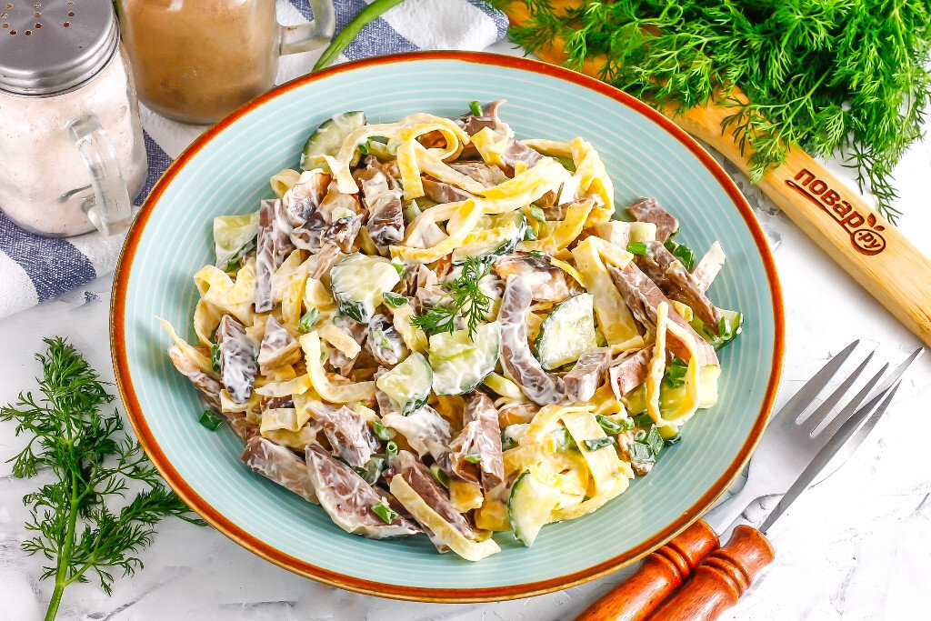 Первый ряд: смешать размятые рыбные кусочки (без позвоночных костей) с майонезной массой + кусочки зелени (укропа, кинзы). Покрыть блином.
