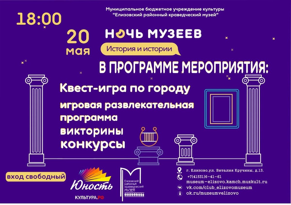 Елизовский районный краеведческий музей приглашает жителей и гостей города окунуться в историю. Именно этой теме посвящена грядущая 20 мая всероссийская акция «Ночь музеев» в Елизове. Желающие могут принять участие в музейном городском фотоквесте, где необходимо пройти по интересным и памятным местам города. В ходе игры участникам предстоит выполнить задания, ответами на которые будут служить фотографии. Предварительная запись для участия по телефону: 8-914-027-78-53. Начало квеста в 16 часов. Кроме того, Дом культуры и творчества молодежи «Юность» проведёт игровую развлекательную программу на территории музея. Гостей ждут весёлые игры, выступления артистов, викторины, конкурсы и подарки. Начало в 18 часов. «Ночь музеев: история и истории» пройдёт на территории районного краеведческого музея по адресу: г. Елизово, ул. В. Кручины, д. 13. Вход свободный.