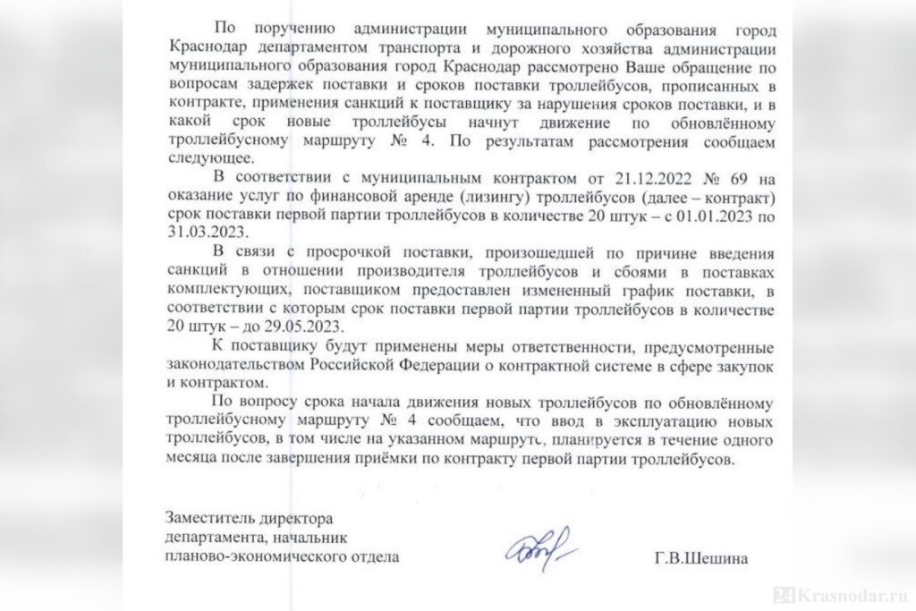 Краснодарская мэрия заказала новый электротранспорт у завода под санкциями и ожидаемо ничего в срок не получила. В соответствии с заключенным муниципальным контрактом от 21.12.2022 №69 в краевую столицу должны были быть поставлены 20 троллейбусов в срок с 01.01.2023 по 31.03.2023, но этого не произошло. Активист написал в мэрию письмо по этому поводу. Чиновники ему ответили, что завод под международными санкциями и поэтому трудности с поставками комплектующих. Сейчас завод обещает поставить троллейбусы до 29 мая. — Поставщика обещают наказать за срыв сроков, но это не точно. Очень удобно прикрываться санкциями, учитывая, что контракт был заключён в декабре 2022-го, и всем было известно, что завод — под санкциями. Что мешало установить более реалистичные сроки исполнения контракта — огромный вопрос, — комментируют происходящее активисты движении «Общественный транспорт Краснодара». Напомним, в Краснодаре родители школьников жалуются на принуждение детей голосовать за угодный властям скв