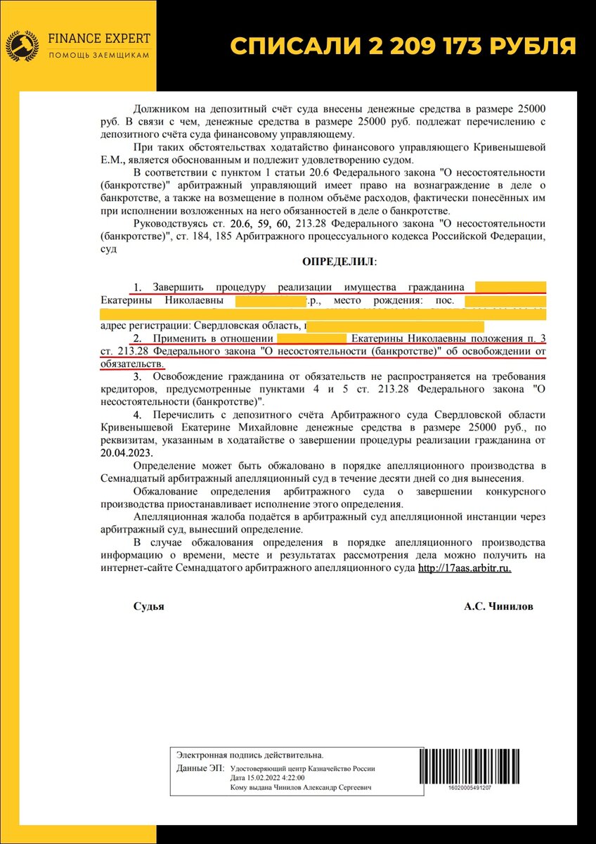 Ежемесячно банки требовали от Екатерины из Свердловской области по 45 000 рублей. Справляться с выплатами по 6-ти кредитам было крайне тяжело, со временем долг стал казаться неподъёмным. После осознания, что выплатить его уже никак не получится, было принято решать проблему по-другому. Тогда женщина обратилась к нам. В итоге за 7 месяцев мы списали все кредиты Екатерины на общую сумму 2 209 173 рубля. Теперь она полностью свободна и может жить полной жизнью, не тратя всю зарплату на взносы по кредитам. Мы благодарим её за отзыв и желаем удачи по жизни! А если вы тоже осознаёте, что выплатить кредит уже не получится, а долг только увеличивается, записывайтесь на бесплатную консультацию к нашим юристам - https://mrqz.me/5eecabc81546890044d4a3bc?utm_source=Dzen&utm_medium=cpc&utm_campaign=Post+Dzen