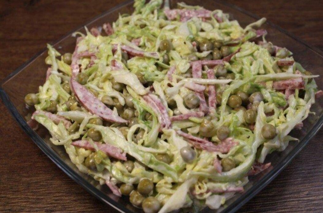 Ингредиенты: 🧀150 г капусты 🧀1 огурец 🧀70 г твердого сыра 🧀100 г копченой колбасы 🧀0,5 банки консервированного горошка 🧀майонез. Приготовление: Нашинкуй капусту, натри сыр и нарежь огурец с колбасой соломкой. Добавь горошек и заправь все небольшим количеством майонеза. Приятного аппетита💟
