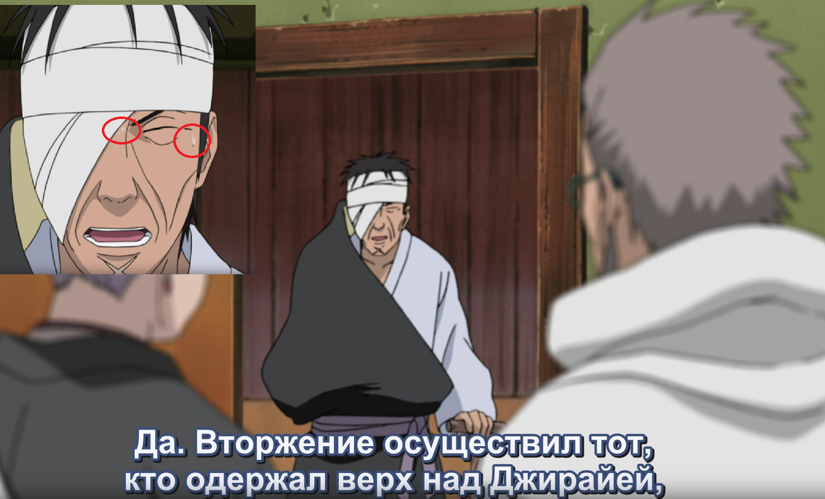 Обратите внимание, на лице Данзо аж проступил пот: он явно интенсивно спешил в этот кабинет, возможно даже двигался не как немощный старик, а скакал как шиноби, но перед заходом внутрь, решил придать себе привычный вид ковыляющего старца. Ну, либо это так будоражаще подействовала на него информация.