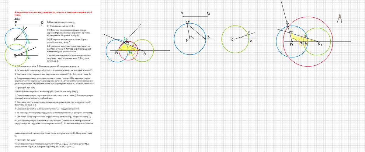 Алгоритм построения треугольника по стороне и двум прилежащим к ней углам.