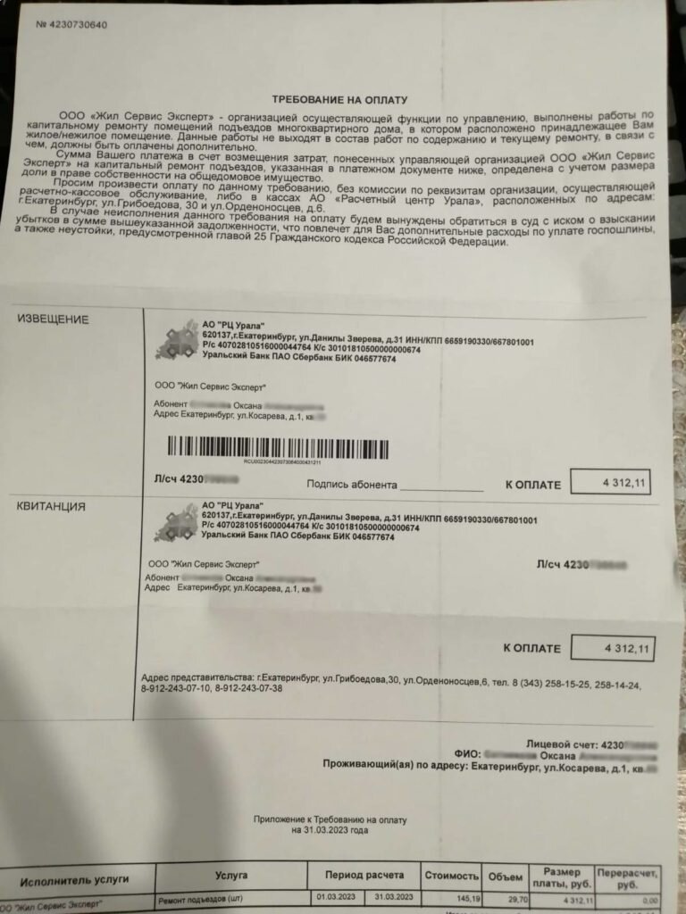 И после удачного прохождения лицензирования, при отсутствующем штате работников, куче штрафов, уголовном деле, огромном долге в апреле 2023 года ООО “ЖИЛ СЕРВИС ЭКСПЕРТ” выдвигает собственникам жилья дома по Косарева, 1 дома свои личные платежные уведомления за капремонт подъездных помещений с обязательством оплатить до определенного срока.