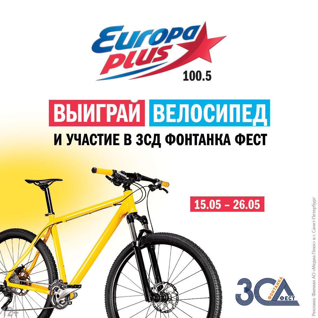 «Европа Плюс» дарит велосипед и приглашает прокатиться по ЗСД Даже если у вас нет велосипеда и команды единомышленников, прокатиться по Западному скоростному диаметру на велозаезде «ЗСД Фонтанка ФЕСТ» возможно! С 15 по 26 мая в эфире «Европы Плюс» в Санкт-Петербурге можно выиграть велосипед и стать участником велокоманды радиостанции, которая берет на заезд и своих слушателей. Все, что нужно — внимательно слушать «Европу Плюс» в Санкт-Петербурге в 12:20 и в 18:20 по московскому времени и после специального сигнала дозвониться в эфир радиостанции по телефону (812) 325 100 5, чтобы сыграть в игру «Велотрек». Суть игры в том, чтобы быстрее соперника — артиста «Европы Плюс» — угадать три песни. Треки прозвучат в ускоренном и замедленном темпе, что создаст атмосферу велогонки, ведь соперник либо ускоряется, либо отстает. Участник, правильно назвавший треки или их исполнителей, приходит к «финишу» первым и получает главный приз — складной велосипед, фирменную футболку «Европы Плюс» в Санкт-П