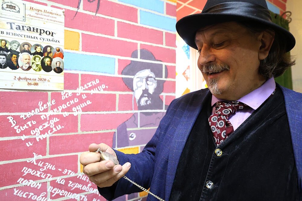 Наш экскурсовод Игорь Пащенко сверяет время по старинным часам 1876 года выпуска - его неизменному талисману, подаренному другом, в семье которого реликвия хранилась, и начинает свой рассказ. Если бы не эта любовная история, произошедшая в XIX веке, на свет не родился бы Антон Павлович Чехов, с которым прежде всего и ассоциируется Таганрог.