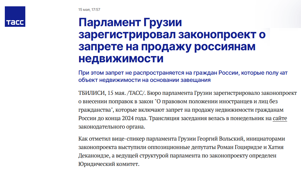 Теперь на очереди Грузия, депутаты которой предложили ввести запрет на покупку недвижимости на территории государства для тех россиян, у которых нет вида на жительство, пишет информационный портал «Новости — Грузия».